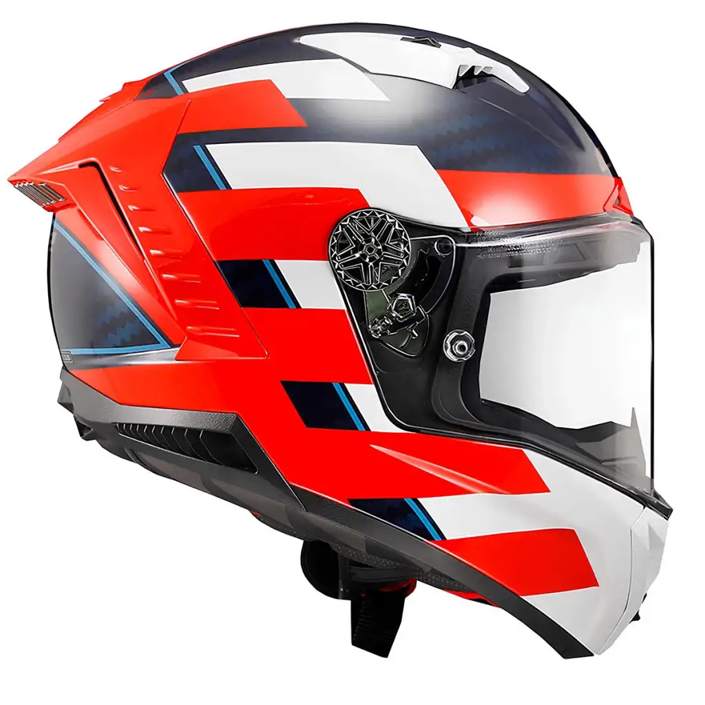 Kırmızı, mavi ve beyazın dinamik birleşimi, kaska modern ve sportif bir görünüm kazandırır. Aerodinamik tasarımı, yüksek hızlarda rüzgâr direncini minimuma indirerek daha dengeli bir sürüş sağlar. Bu özellik, hem pistte hem de uzun yolculuklarda üst düzey performans sunar.