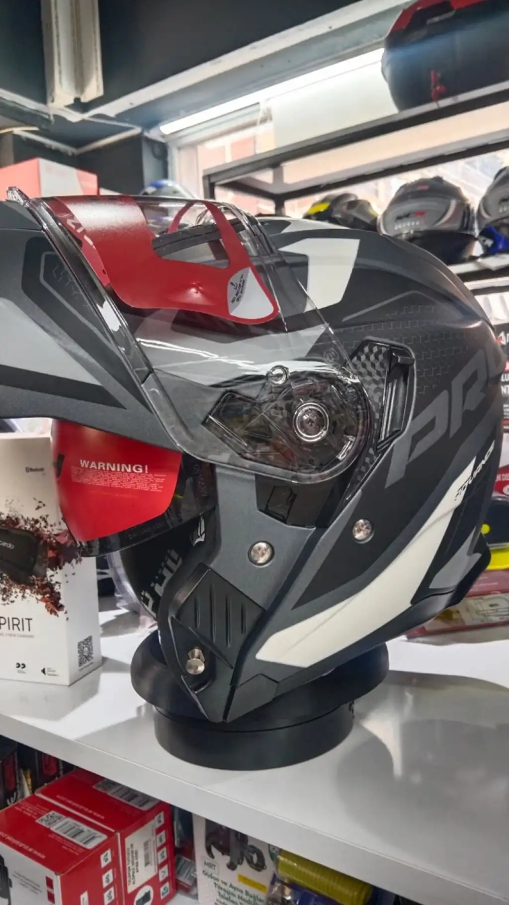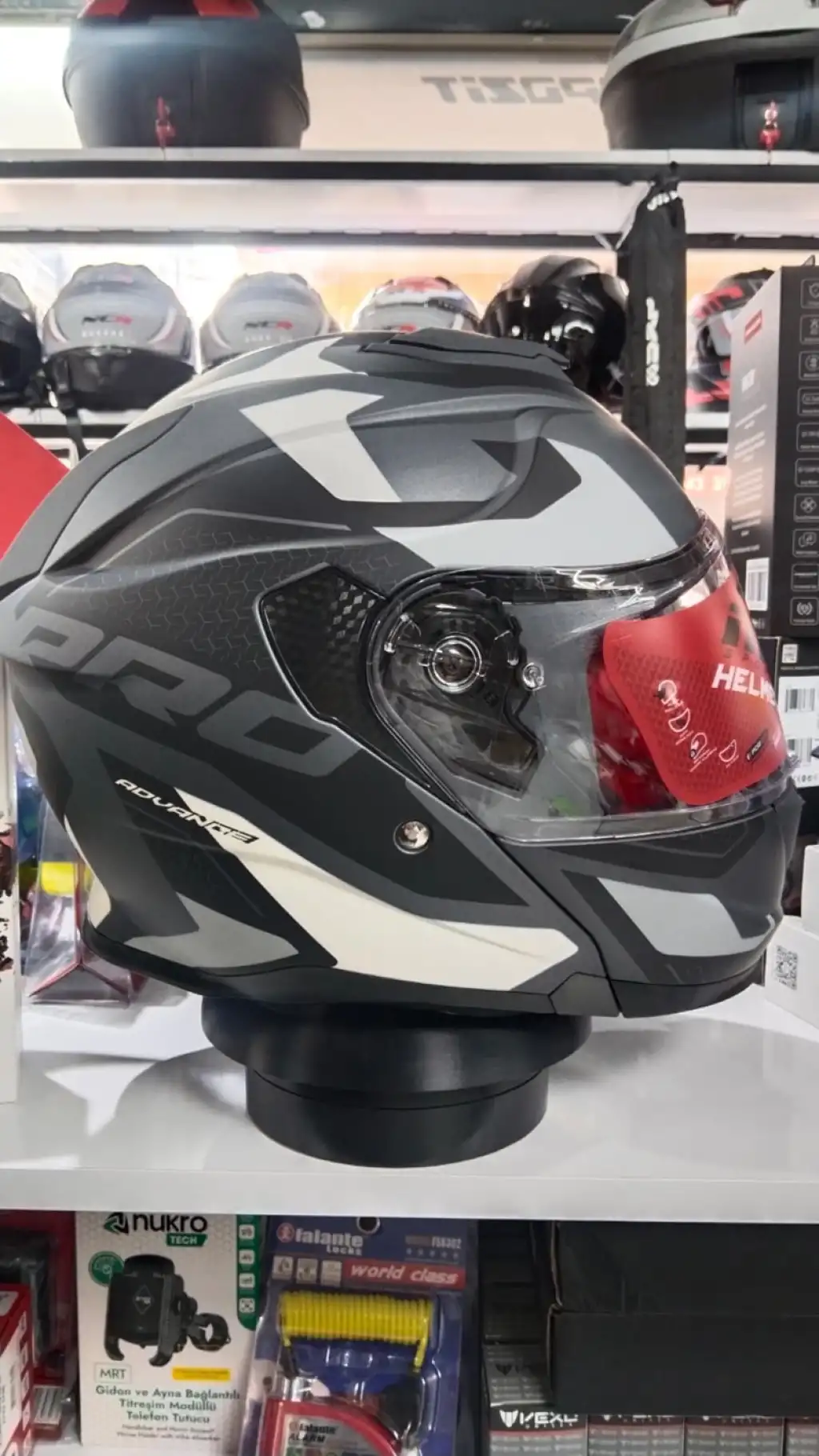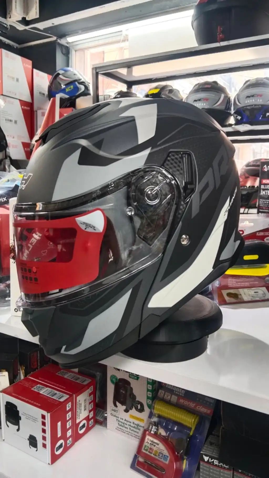 Kaskın sağlam dış kabuğu darbeye dayanıklı materyalden üretilmiştir. Olası kazalarda darbe enerjisini absorbe ederek baş bölgesini etkin şekilde korur. Açılır çene sistemi sağlam kilit mekanizması sayesinde çenelik açık konumdayken bile stabil durur ve sürüş güvenliğini bozmaz. Mat gri sticker kaplama ise kaska modern, şık ve premium bir görünüm kazandırır.